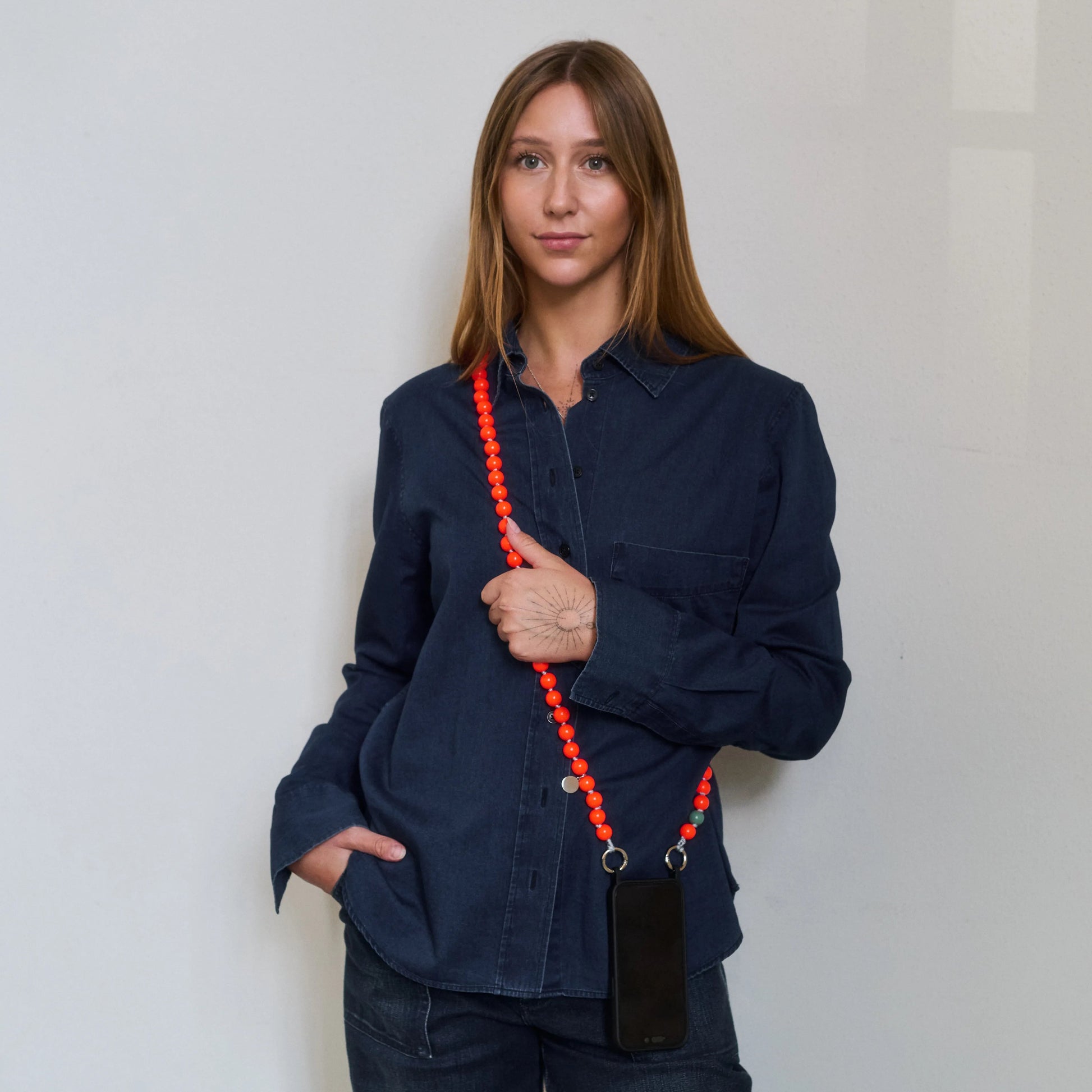 All our wooden beads phone chains are made by moms from home - with fair conditions and beyond average wages in Germany. This allows our artisans to financially support their families while working from home, balancing work with being present as well for the kids. As a female run business we know very well about the challenges to work and stay connected to your kids. As an additional highlight, our employees are inspired to listen to their own music or enjoy interesting podcasts while working, which contributes to a pleasant and relaxed working atmosphere. The wooden bead chains are made with a special knotting technique, where each bead is individually knotted to the cord. This makes the chain look a bit stiffer at the beginning. Over time and with usage it naturally becomes more smooth and extremely comfortable to wear. Nevertheless, thanks to this technique, the wooden beads always stay in place, so you can enjoy your necklace for a long time - even over several smartphone generations.