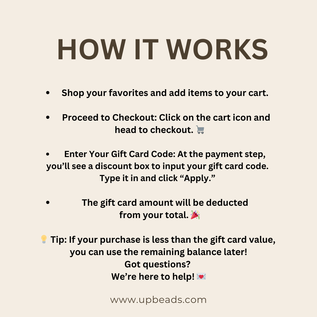 Gift cards are delivered by email and contain instructions to redeem them at checkout. Our UPBEADS gift cards have no additional processing fees.